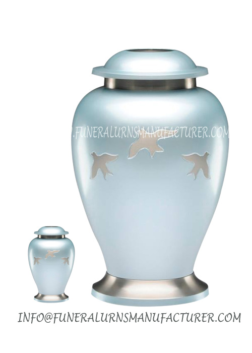 DETAILS : This Avondale urn is engraved with going home birds in pewter finish & colored in sky blue