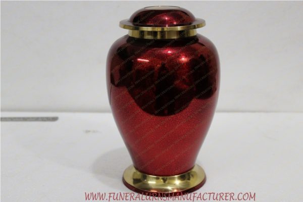 This Urn is crafted with love & emotion by our highly experienced artisian team, we offer the finest quality of Brass Cremation Urns, it is spray painted in droplet format in shinny red color & a outline touch of bright brass finish on Lid & Bottom of the urn whereas, inside is colored with black paint. Our urns are crafted by our creative artisans utilizing the finest quality of brass & alloy and high-end carving tools. This urn is available with a “screw-on” top lid and felt on bottom and is used for decorating the interior of houses, offices and other places to keep our loved ones close to our hearts.