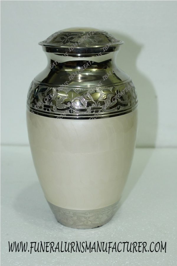 CLASSIC BRASS CREMATION URN – WHITE ENAMELED & NICKEL PLATED (FUM/HB/1052)