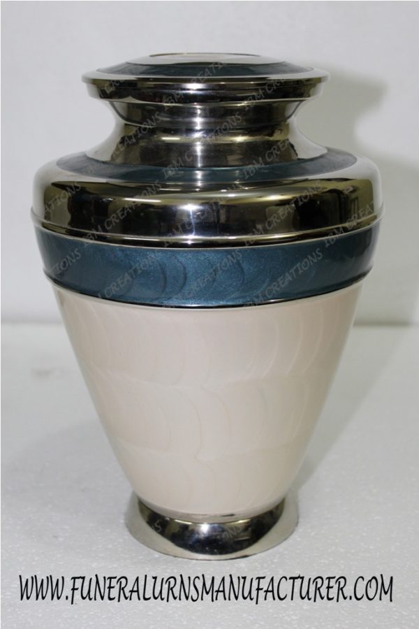 MILANO BRASS CREMATION URN – BLUE & WHITE ENAMELED & NICKEL PLATED (FUM/HB/1060)