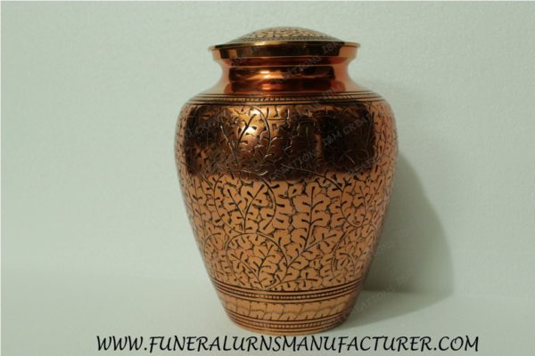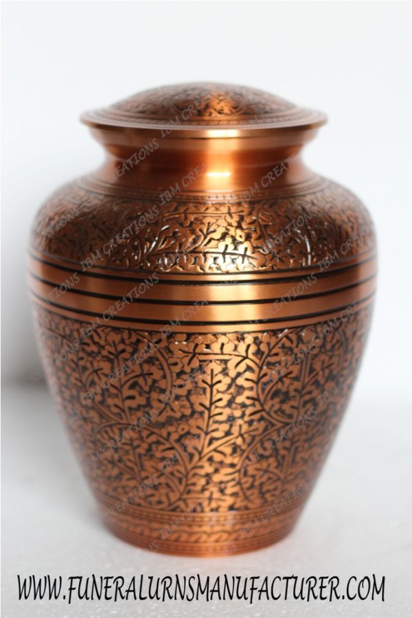 This Urn is crafted with love & emotion by our highly experienced artisian team, we offer the finest quality of Brass Cremation Urns which is fully engraved with floral design & copper finished whereas, inside is colored with black paint. Our urns are crafted by our creative artisans utilizing the finest quality of brass & alloy and high-end carving tools. This urn is available with a “screw-on” top lid and felt on bottom and is used for decorating the interior of houses, offices and other places to keep our loved ones close to our hearts.